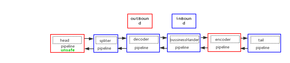 可以看到,数据开始出站,从后向前开始流动,和入站的方向是反的。那么最后会走到哪里呢,当然是走到 head 节点,因为 head 节点就是 outbound 类型的 handler。