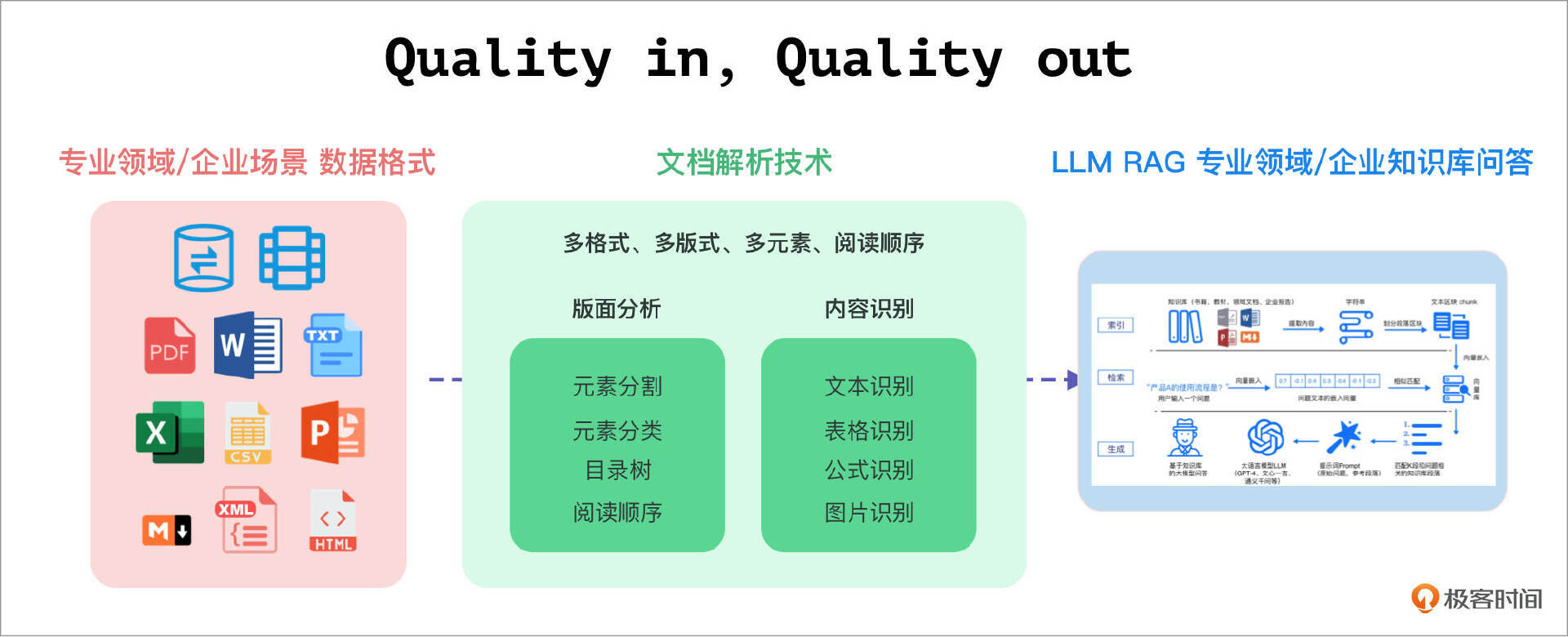 在之前的课程中,我们了解到,RAG(检索增强生成)系统的首要步骤是索引(Indexing)流程中的文档解析。文档解析技术的本质在于将格式各异、版式多样、元素多种的文档数据,包括段落、表格、标题、公式、多列、图片等文档区块,转化为阅读顺序正确的字符串信息。“Quality in, Quality out” 是大模型技术的典型特征,高质量的文档解析能够从各种复杂格式的非结构化数据中提取出高精准度的信息,对RAG系统最终的效果起决定性的作用。