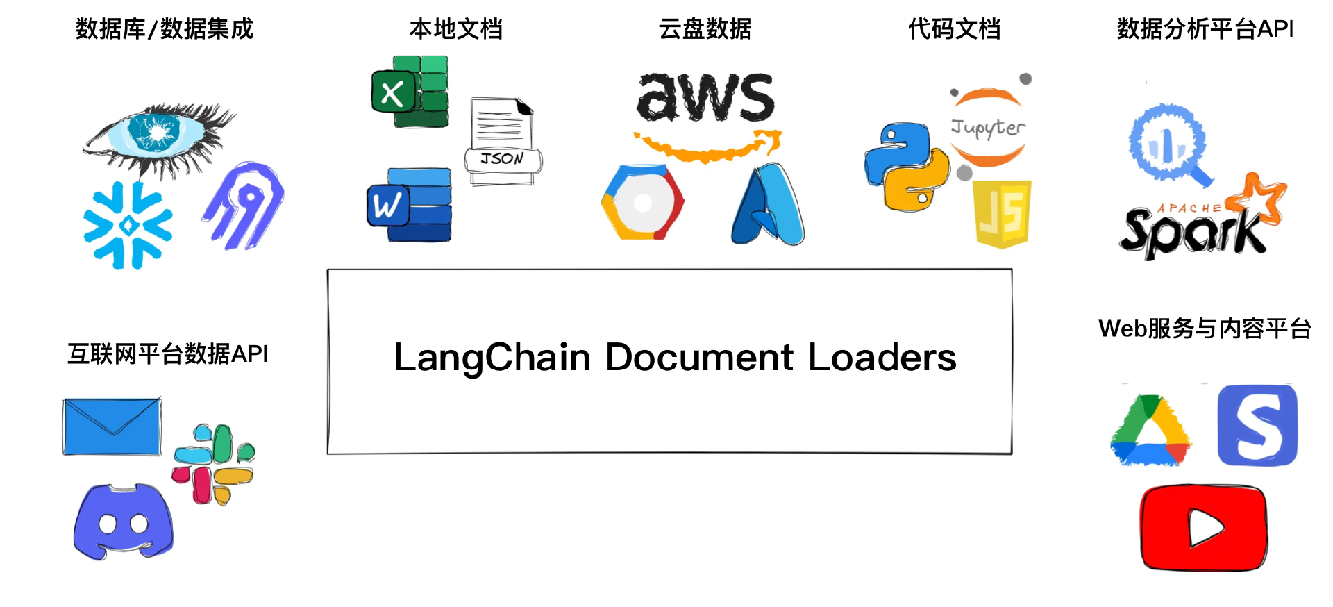 langchain_community 是 LangChain 与常用第三方库相结合的拓展库。各类开源库和企业库基于 BaseLoader 类在 langchain_community 库中扩展了不同文档类型的加载器,这些加载器被归类于 langchain_community.document_loaders 模块中。每个加载器都可以输入对应的参数,如指定文档解析编码、解析特定元素等,以及对 Document 类进行提取或检索等操作。目前,已有超过 160 种数据加载器,覆盖了本地文件、云端文件、数据库、互联网平台、Web 服务等多种数据源。详情可以在 LangChain 官网查看。