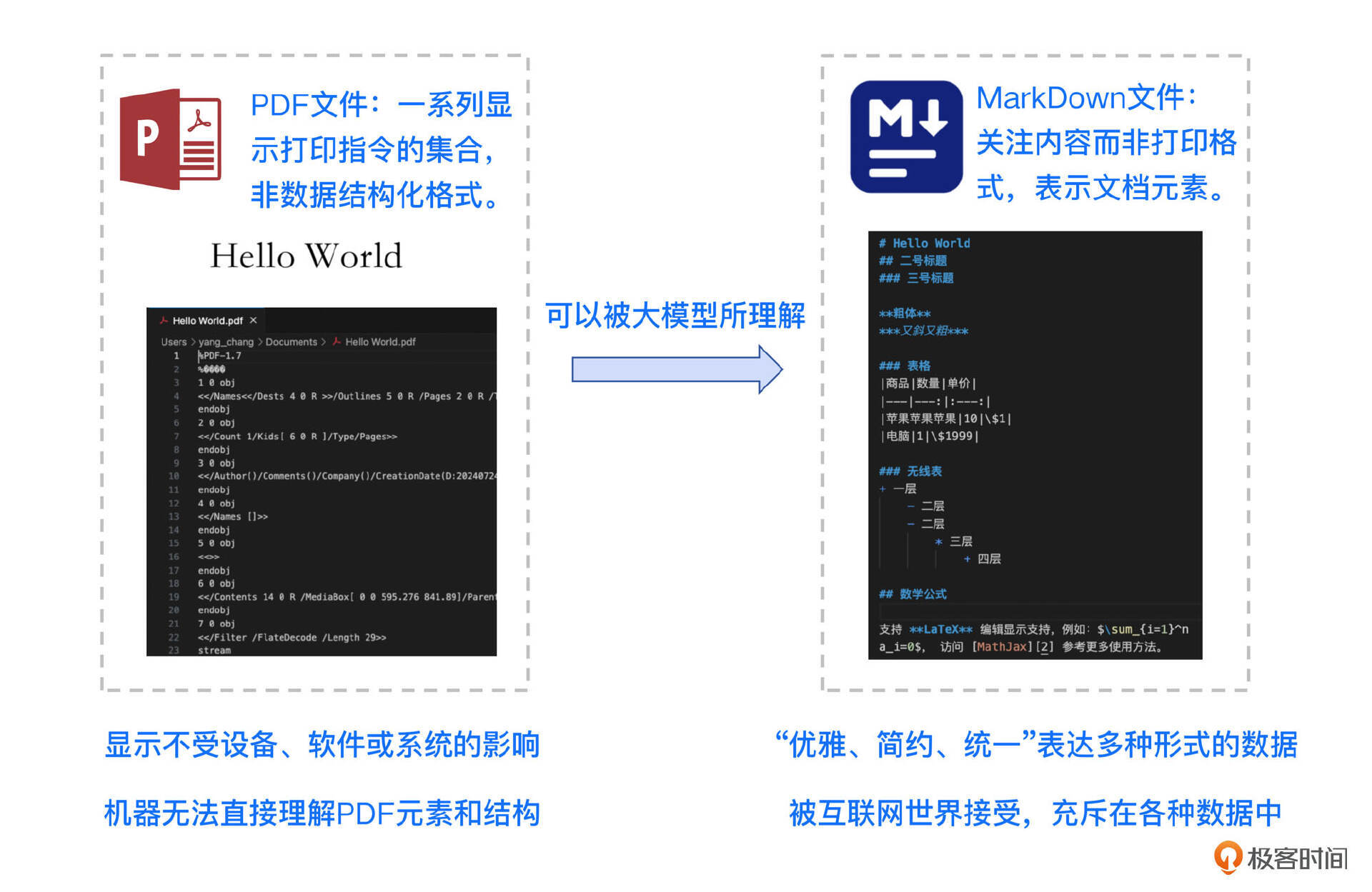 PDF解析,对于纯文本格式可以转换为文本字符串,而对于包含多种元素的复杂格式,选择 MarkDown 文件作为统一的输出格式最为合适。这是因为MarkDown文件关注内容本身,而非打印格式,能够表示多种文档元素内容。MarkDown格式被广泛接受于互联网世界,其信息能够被大模型理解。