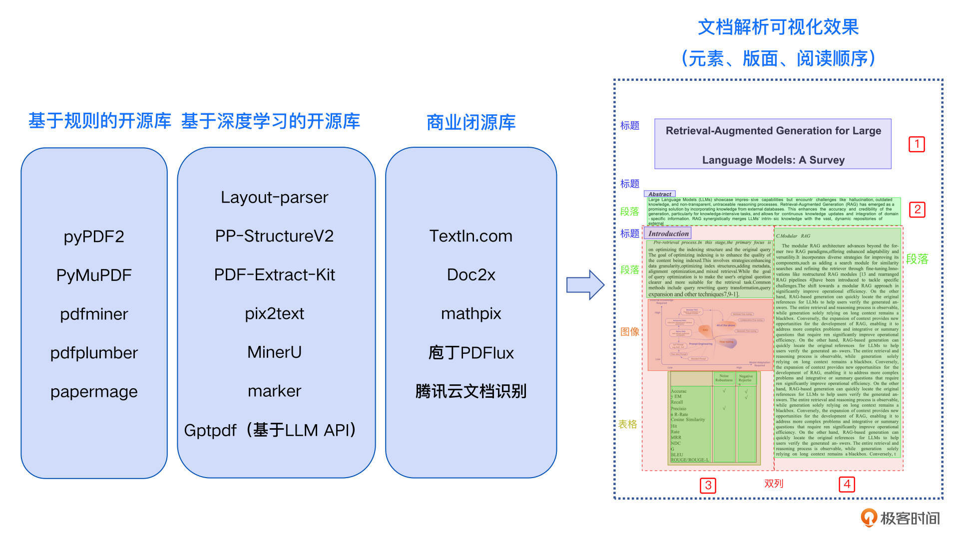 在基于规则的开源库中,pdfplumber对中文支持较好,且在表格解析方面表现优秀,但对双栏文本的解析能力较差;pdfminer和PyMuPDF对中文支持良好,但表格解析效果较弱;pyPDF2对英文支持较好,但中文支持较差;papermage集成了pdfminer和其他工具,特别适合处理论文场景。开发者可以根据实际业务场景的测试结果选择合适的工具,pdfplumber或pdfminer都是当前不错的选择。