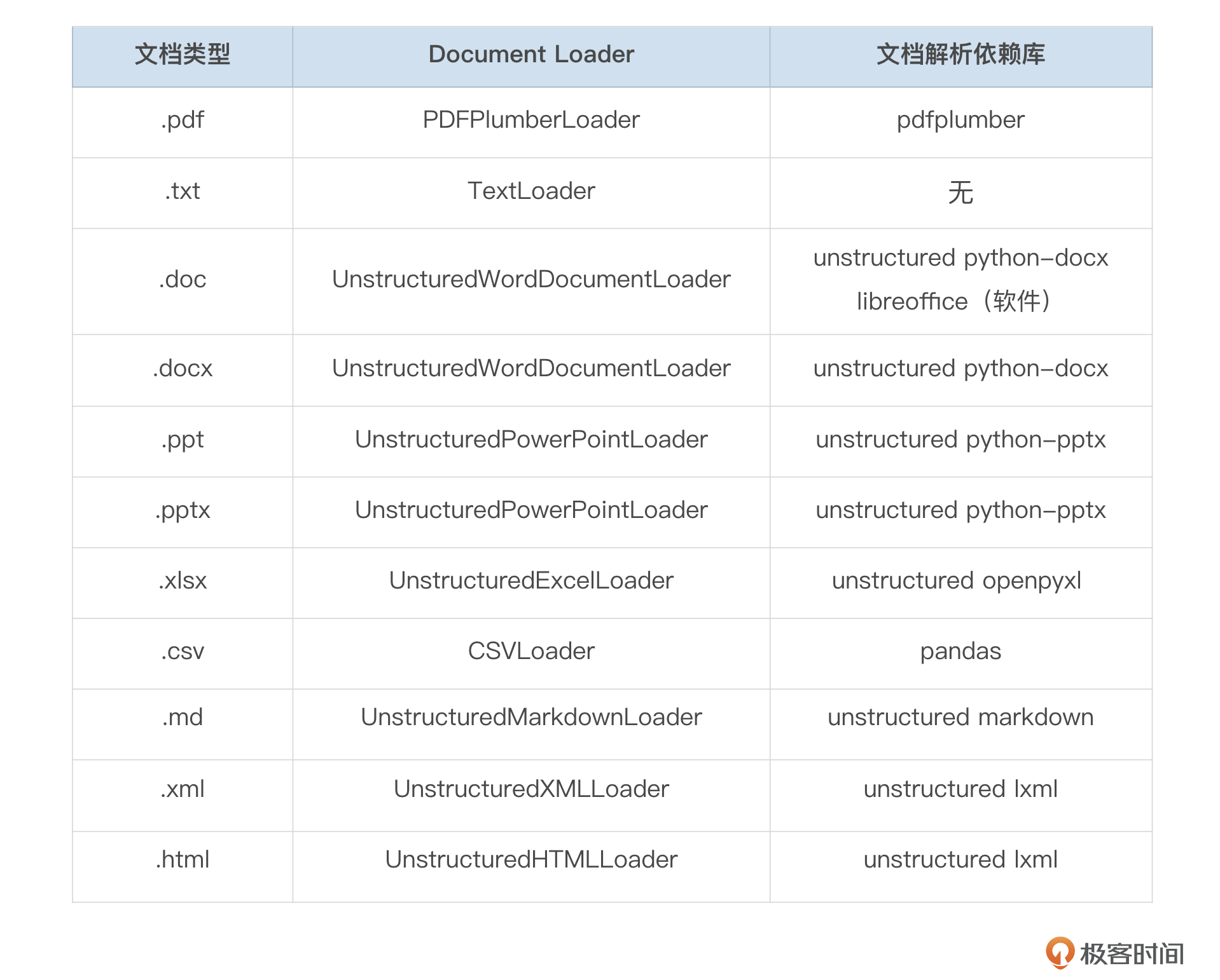 本次实战我们将解析不同类型的文档,其对应的 Document Loader 和所需的文档解析依赖库如下表所示:
