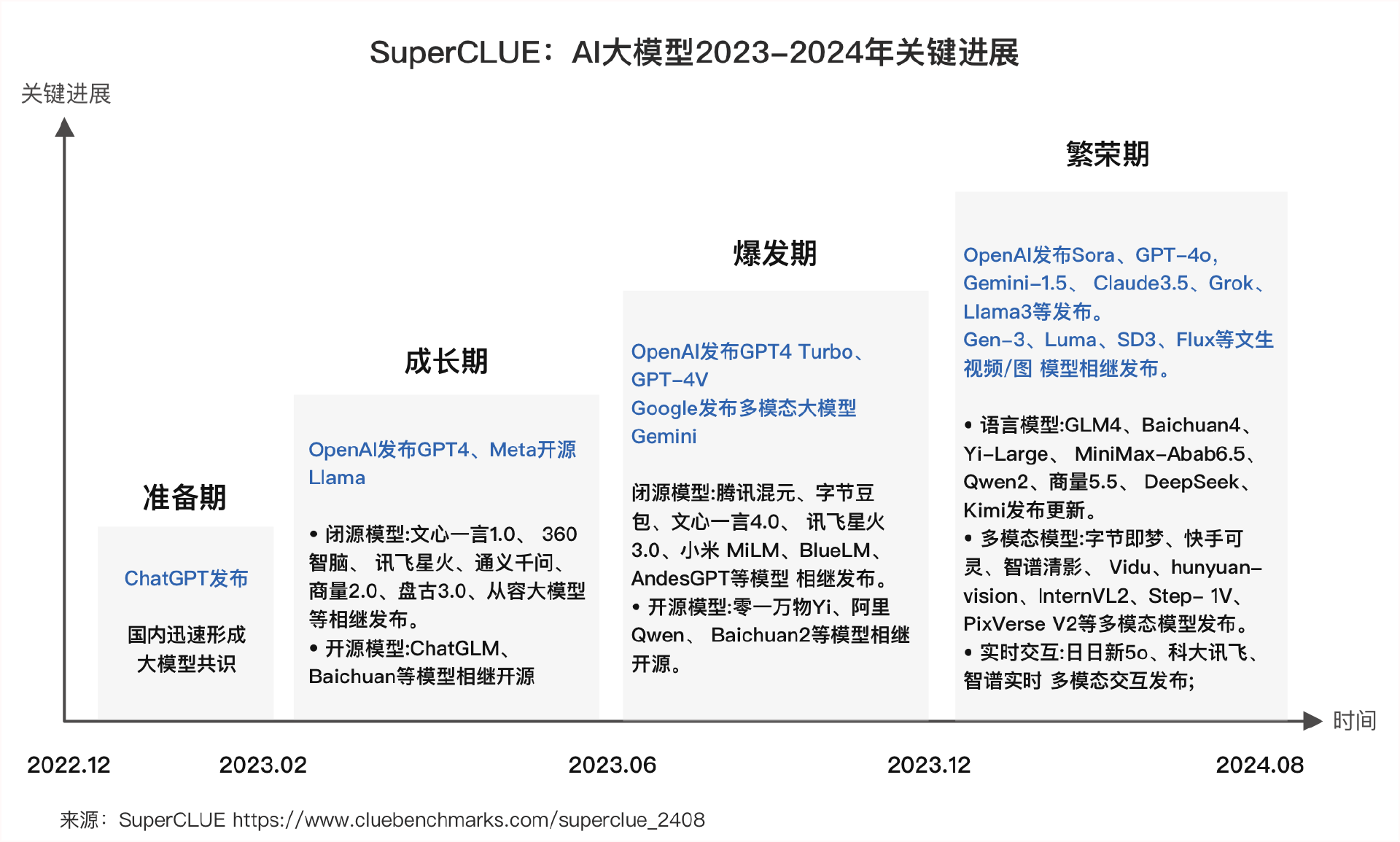 根据中文大模型综合性测评基准SuperCLUE组织发布的2024年8月报告阐述,AI大模型2023-2024年关键进展大致可以分为四个阶段。