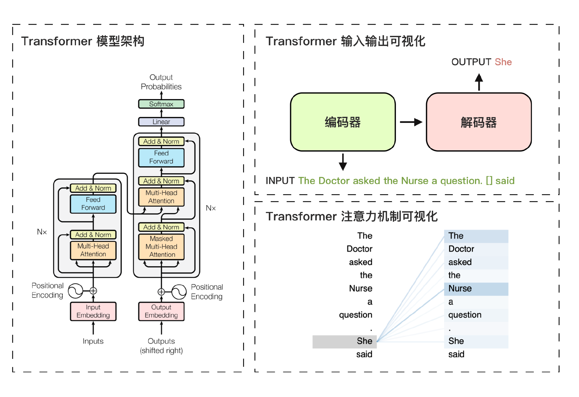 上图展示了Transformer模型的架构及其核心机制的可视化示例。左图中,Transformer模型由编码器和解码器两部分组成。编码器负责理解输入信息的顺序和语义,解码器则输出概率最高的词元。