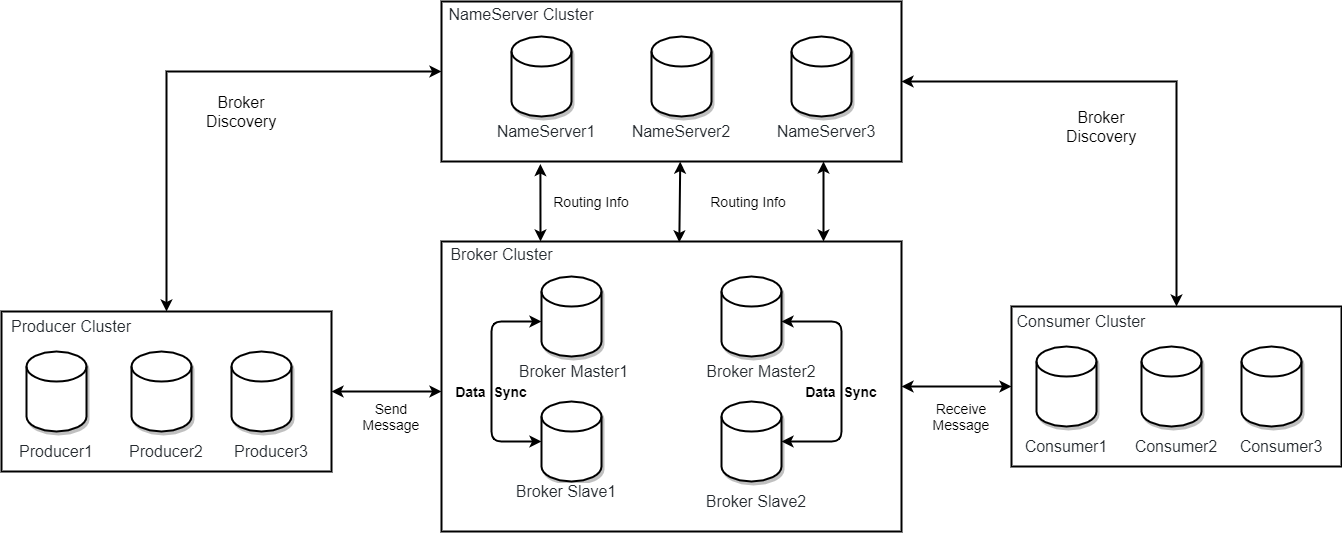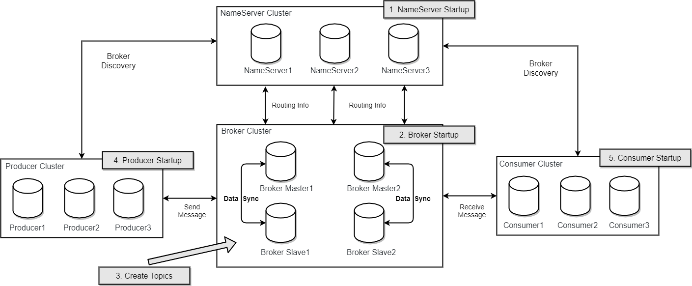 RocketMQ消息队列集群主要包括NameServer、Broker(Master/Slave)、Producer、Consumer4个角色,基本通讯流程如下: