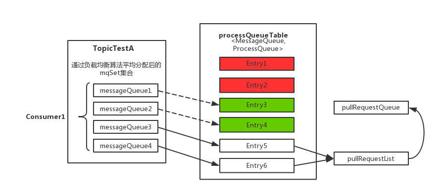 - 上图中processQueueTable的绿色部分,表示与分配到的消息队列集合mqSet的交集。判断该ProcessQueue是否已经过期了,在Pull模式的不用管,如果是Push模式的,设置Dropped属性为true,并且调用removeUnnecessaryMessageQueue()方法,像上面一样尝试移除Entry;