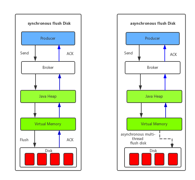 (1) 同步刷盘:如上图所示,只有在消息真正持久化至磁盘后RocketMQ的Broker端才会真正返回给Producer端一个成功的ACK响应。同步刷盘对MQ消息可靠性来说是一种不错的保障,但是性能上会有较大影响,一般适用于金融业务应用该模式较多。