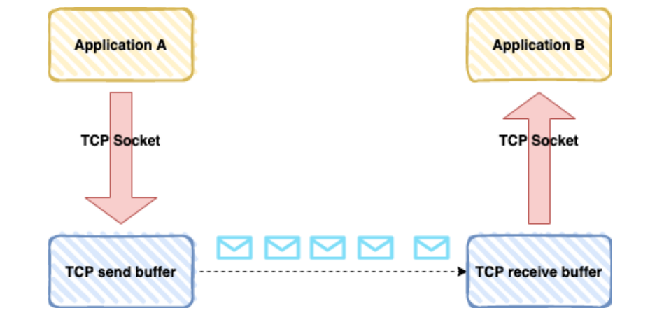 TCP 是⾯向字节流的协议,它会将应⽤层发送的数据拆分成 TCP 报⽂段进⾏传输,发送端和接收端都会维护⼀个 buffer ,发送的数据⾸先会存⾄缓冲区 buffer ,然后通过⽹络发送给接收端的 buffer 中。