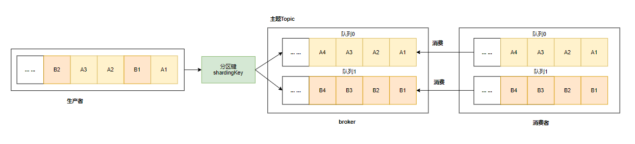 如果是普通消息,订单A的消息可能会被轮询发送到不同的队列中,不同队列的消息将⽆法保持顺序,⽽顺序消息发送时 RocketMQ ⽀持将 Sharding Key 相同(例如同⼀订单号)的消息序路由到⼀个队列中 。