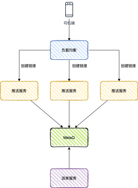 派单服务是⽣产者,将派单数据发送到 MetaQ , 每个推送服务都会消费到该消息,推送服务判断本地内存中是否存在该司机的 TCP channel , 若存在,则通过 TCP 连接将数据推送给司机端。