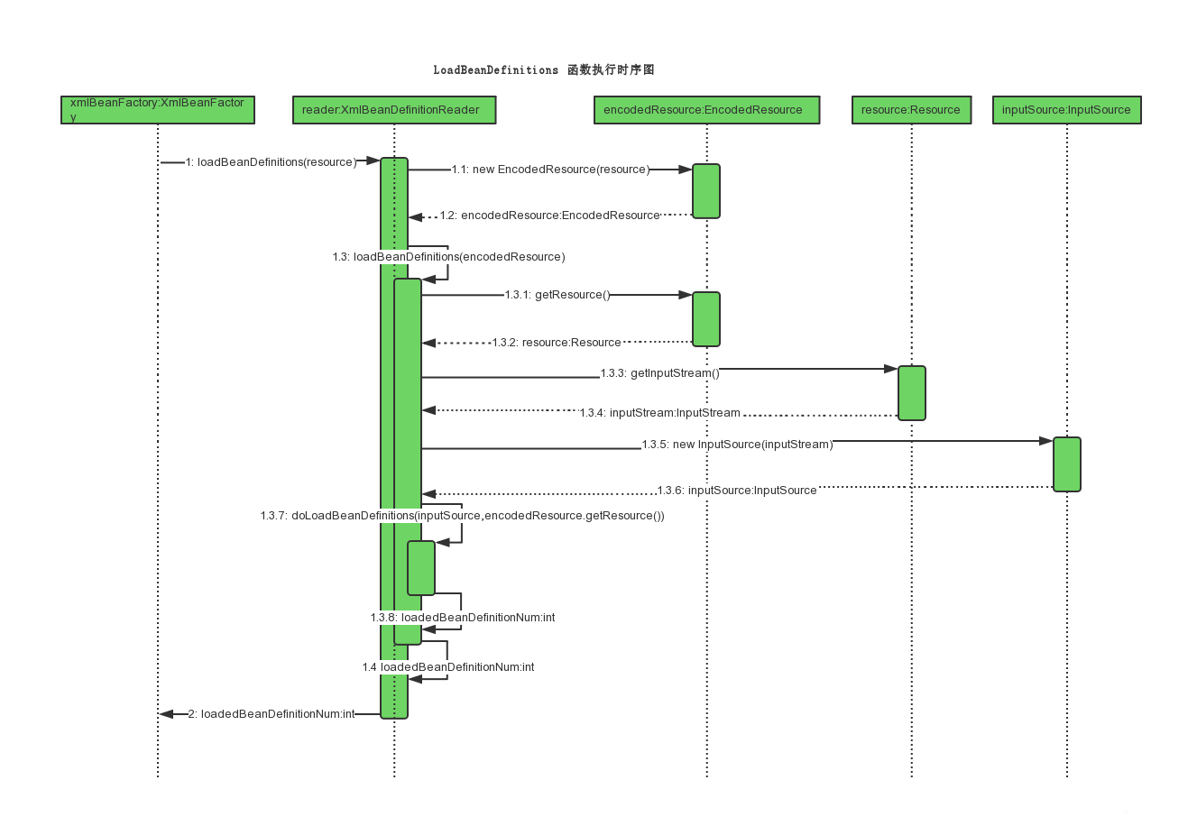 5.2 bean加载 在之前XmlBeanFactory构造函数中调用了XmlBeanDefinitionReader类型的reader属性提供的方法this.reader.loadBeanDefinitions(resource),而这句代码则是整个资源加载的切入点,这个方法的时序图如下: