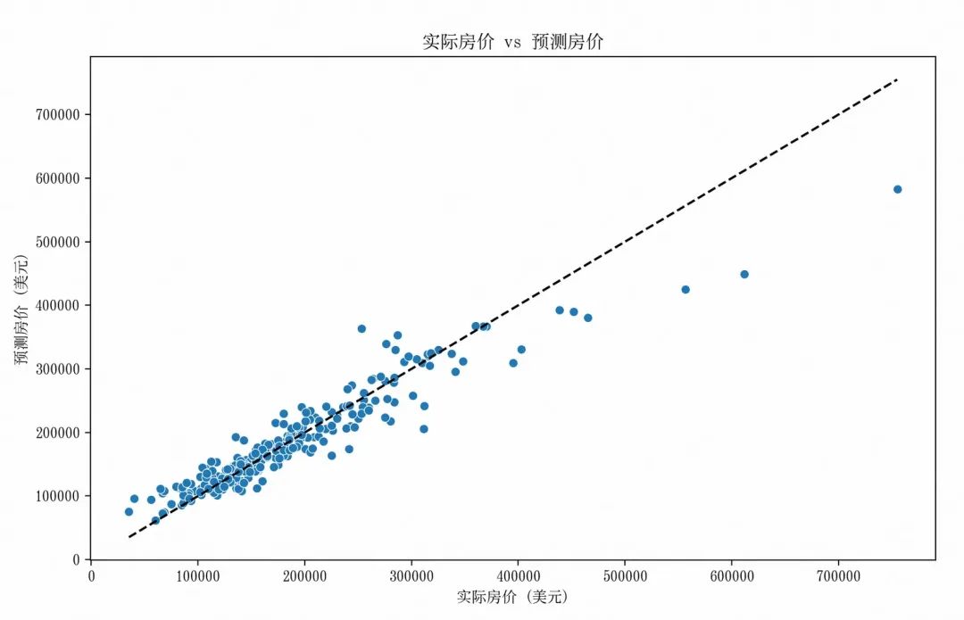 图中大部分点分布在对角线(理想预测线)附近,表明模型在一定程度上能够反映实际房价的趋势,对中低房价区域的预测有一定合理性。