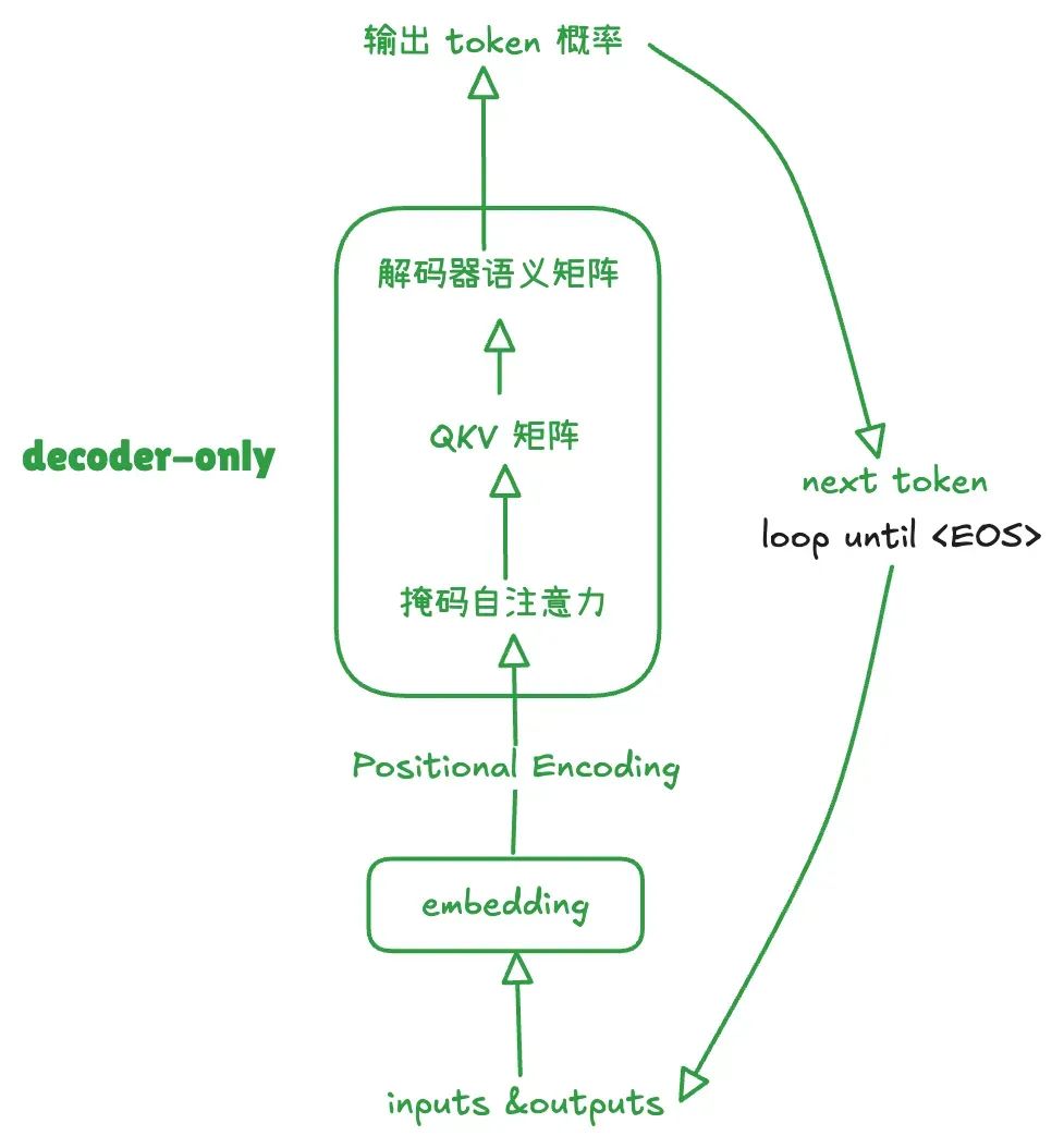 在 GPT 中没有了编码器,首先会把用户输入当做初始化的历史输出,使用掩码注意力机制生成 QKV 矩阵,然后预测下一个 token,直到遇到结束符