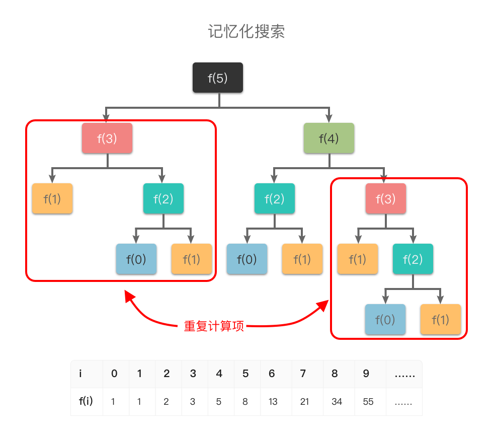 从图中可以看出:如果使用普通递归算法,想要计算 f(5),需要先计算 f(3) 和 f(4),而在计算 f(4) 时还需要计算 f(3)。这样 f(3) 就进行了多次计算,同理 f(0)、f(1)、f(2) 都进行了多次计算,从而导致了重复计算问题。