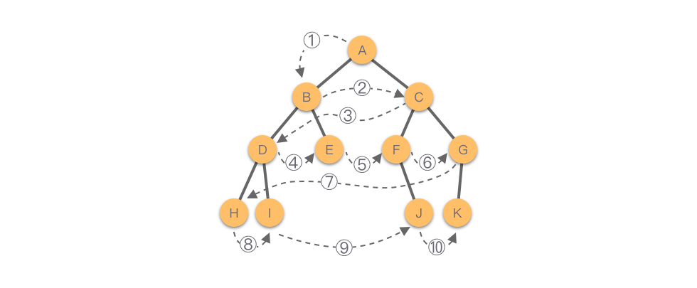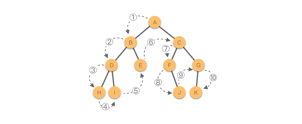 如下图所示,该二叉树的前序遍历顺序为:𝐴−𝐵−𝐷−𝐻−𝐼−𝐸−𝐶−𝐹−𝐽−𝐺−𝐾。