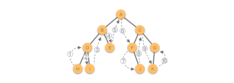 如下图所示,该二叉树的中序遍历顺序为:𝐻−𝐷−𝐼−𝐵−𝐸−𝐴−𝐹−𝐽−𝐶−𝐾−𝐺。