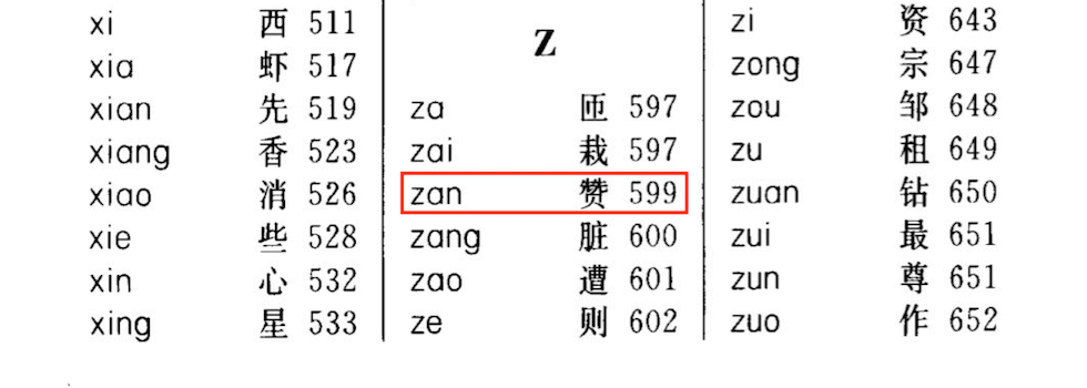 比如为了查找 赞 这个字的具体意思,我们在字典中根据这个字的拼音索引 zan,查找到对应的页码为 599。然后我们就可以翻到字典的第 599 页查看 赞 字相关的解释了。