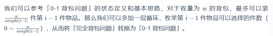 - 完全背包问题中状态为 dp[i] [w−weight[i−1]]+value[i−1],这是第 i 阶段上的状态值。