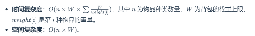- 时间复杂度:O(n×W),其中 n 为物品种类数量,W 为背包的载重上限。