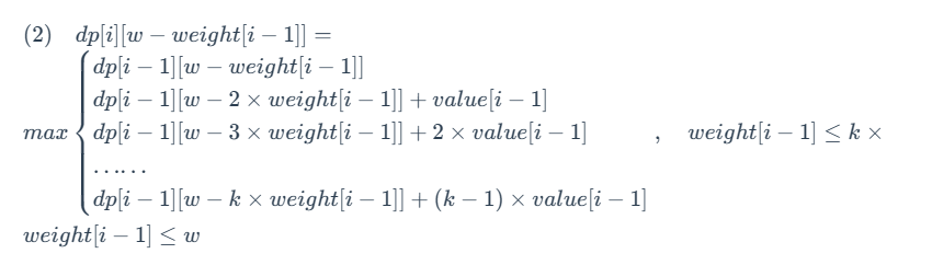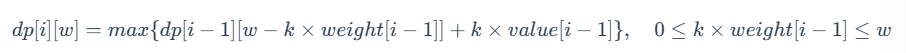 - 选择 k 件第 i−1 件物品:可以获得的最大价值为 dp[i−1] [w−k×weight[i−1]]+k×value[i−1]。