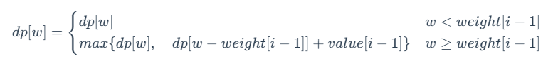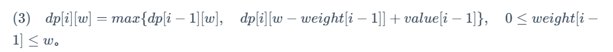 注意:式 (3) 的满足条件为 0≤weight[i−1]≤w。当 w<weight[i−1] 时,dp[i] [w]=dp[i−1] [w]。