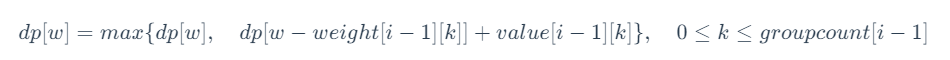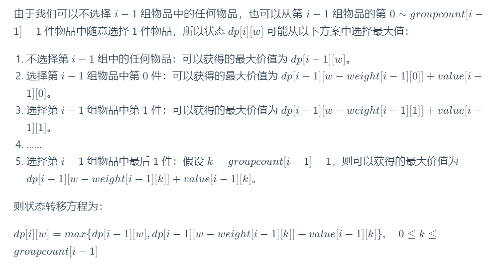 状态 dp[i] [w] 是一个二维数组,其中第一维代表「当前正在考虑的物品组数」,第二维表示「当前背包的载重上限」,二维数组值表示「可以获得的最大价值」。