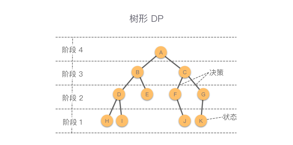 树形动态规划:简称为「树形 DP」,是一种在树形结构上进行推导的动态规划方法。如下图所示,树形 DP 的求解过程一般以节点从深到浅(子树从小到大)的顺序作为动态规划的「阶段」。在树形 DP 中,第 1 维通常是节点编号,代表以该节点为根的子树。