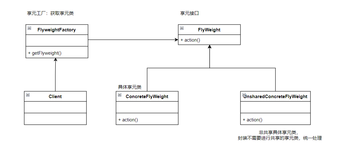 FlyweightFactory: 创建并管理享元对象,当用户请求时,提供已创建的实例或者创建一个。 - 客户端