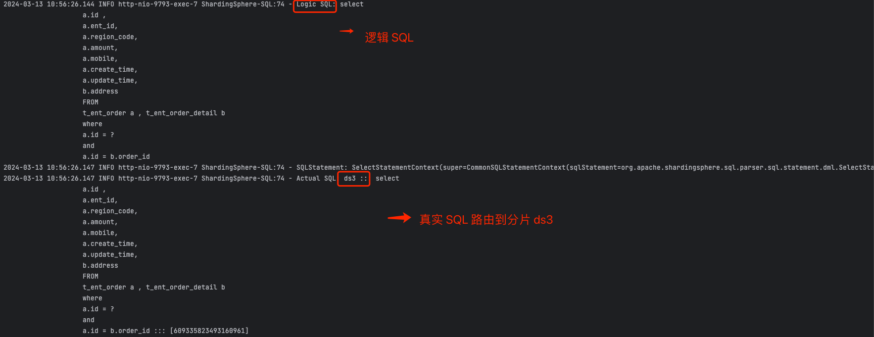 我们插入1 条订单记录、1 条订单详情表进入 ds3 分片,并且 2 条订单条目表进入 ds3 分片的 t_ent_order_item_7 表。