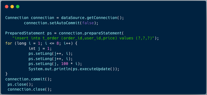 接下来, 获取连接,测试向 t_order 表插入8条数据,8条数据会分散到2个表 。