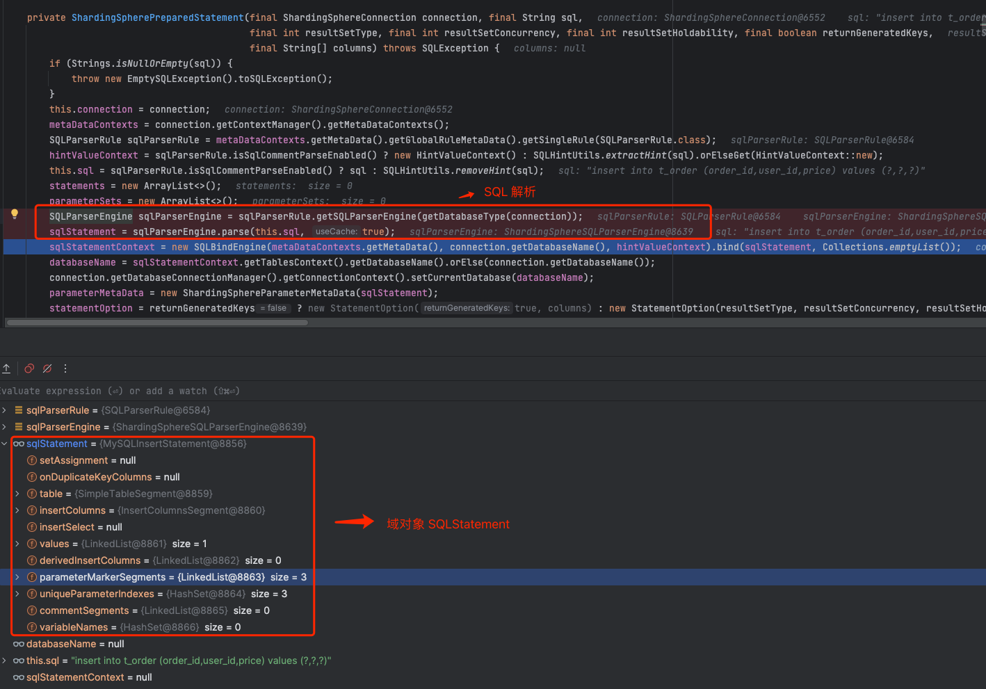 图中,ShardingSpherePreparedStatement 的构造函数内部完成了 SQL 解析 , 域对象是 MySQLInsertStatement 。