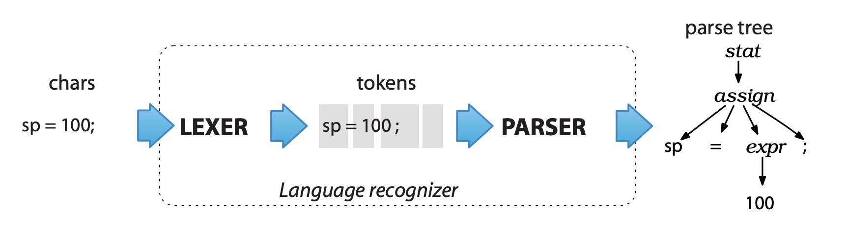 以赋值语句 sp = 100; 为例,ANTLR 会根据如下的语法规则生成词法分析器和语法分析器: