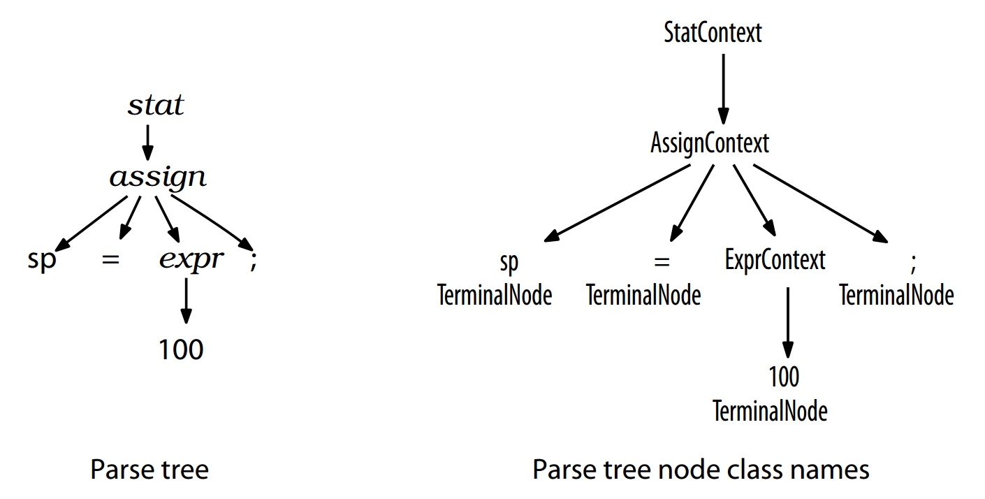 左图中 stat、assign、expr 代表的是规则节点(RuleNode),对应 ANTLR 语法定义中的规则名称,sp、100 对应的是终端节点(TerminalNode),即词法符号。