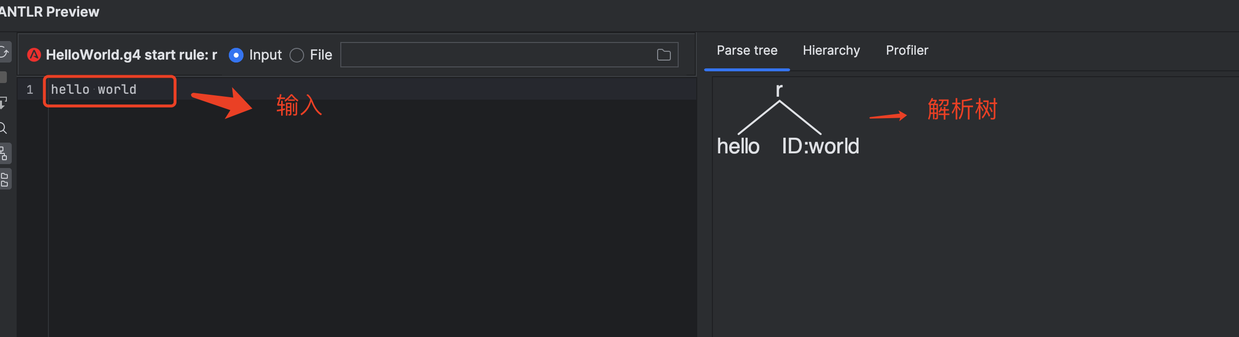 文件开头的 grammar HelloWorld 定义了语法名,ANTLR 中规定语法名必须和文件名保持一致。