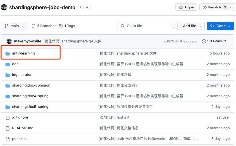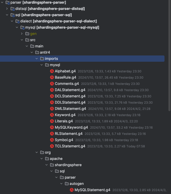 shardingsphere 的 antlr4 描述文件,笔者已经放到开源项目模块里,大家有兴趣的话,可以去查看下。