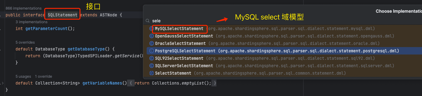 SQLStatement 是一个基础接口,而实现类支持不同的数据库方言的 SELECT 、DELETE 等相关操作。
