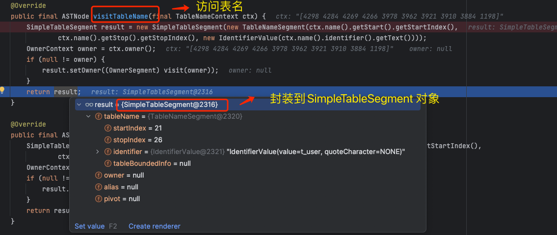 当访问到表名节点时,将解析出来的表名信息封装到 SimpleTableSegment 对象里。
