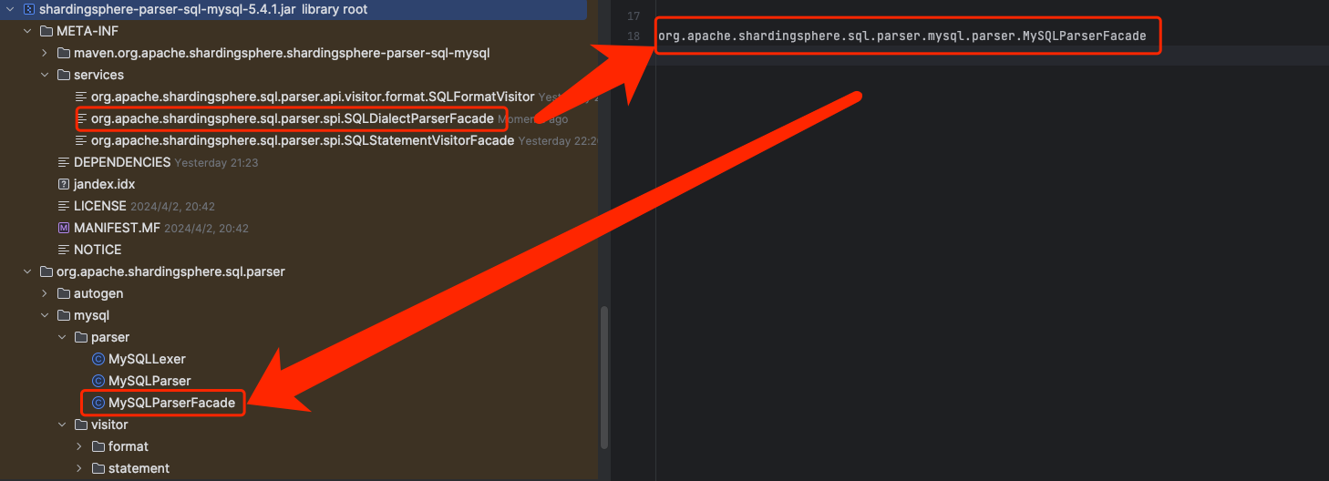 当我们指定数据库方言是 MySQL 时,实际上指向的是:MySQLParserFacade 。