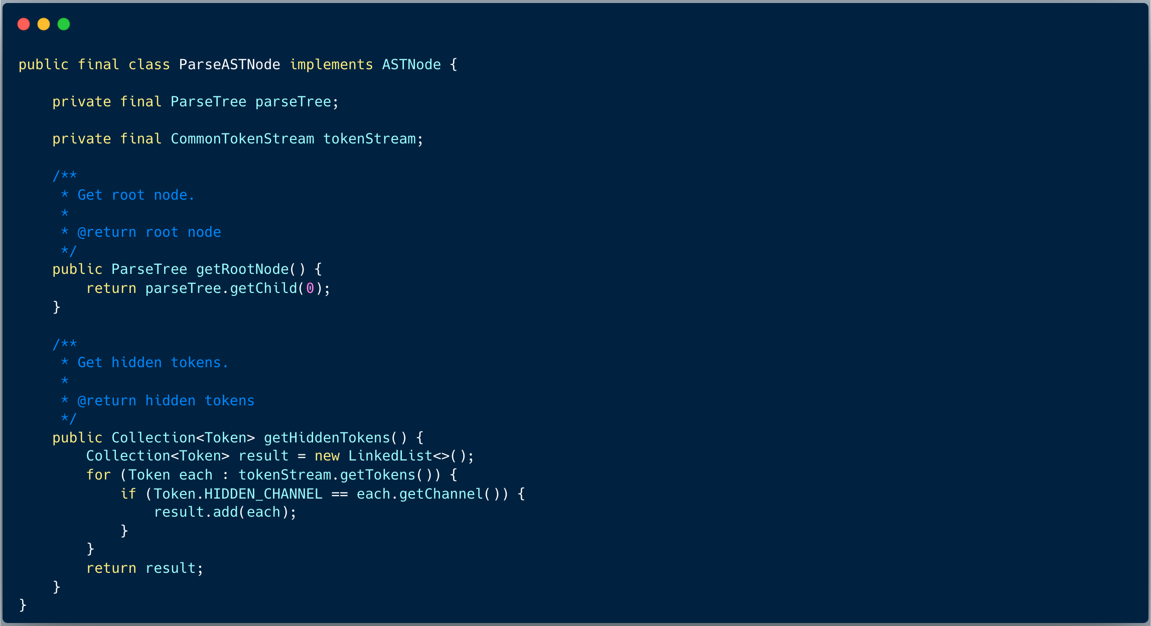 最后解析出来抽象语法树 ParseASTNode 是一个包装类,将 antlr 的对象 ParseTree 、CommonTokenStream 包装起来。