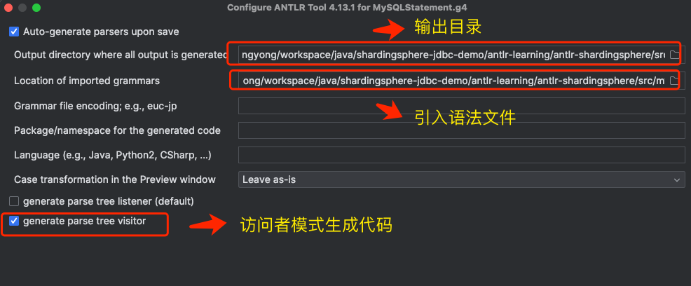 我们通过 IDEA antlr 插件将 MySQLStatement.g4 配置生成相关代码: