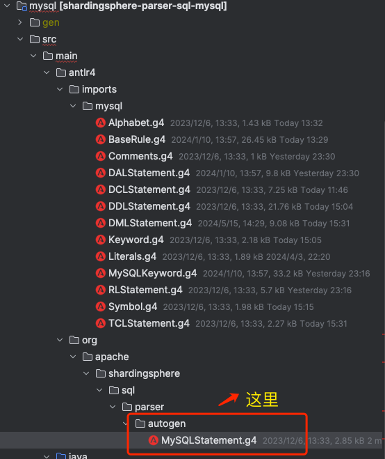 shardingsphere 的 解析引擎模块,支持解析不同数据库 ,比如 MySQL 、Oracle 、Postgresql 等,针对不同的数据,都定义不同的 antlr4 描述文件 。