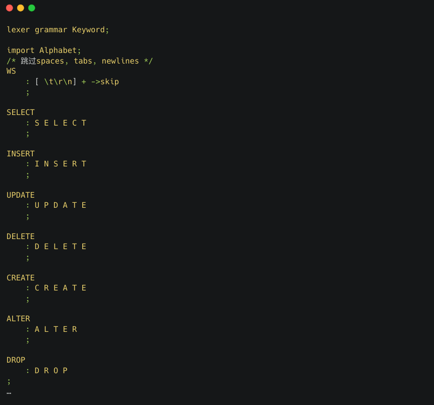 这段描述内容定义了 MySQL 的关键字的规则,每个规则匹配相应的 SQL 关键字 。比如 匹配关键字 MAX,其中 M, A, X 是从 Alphabet.g4 中导入的规则,匹配单个字母。