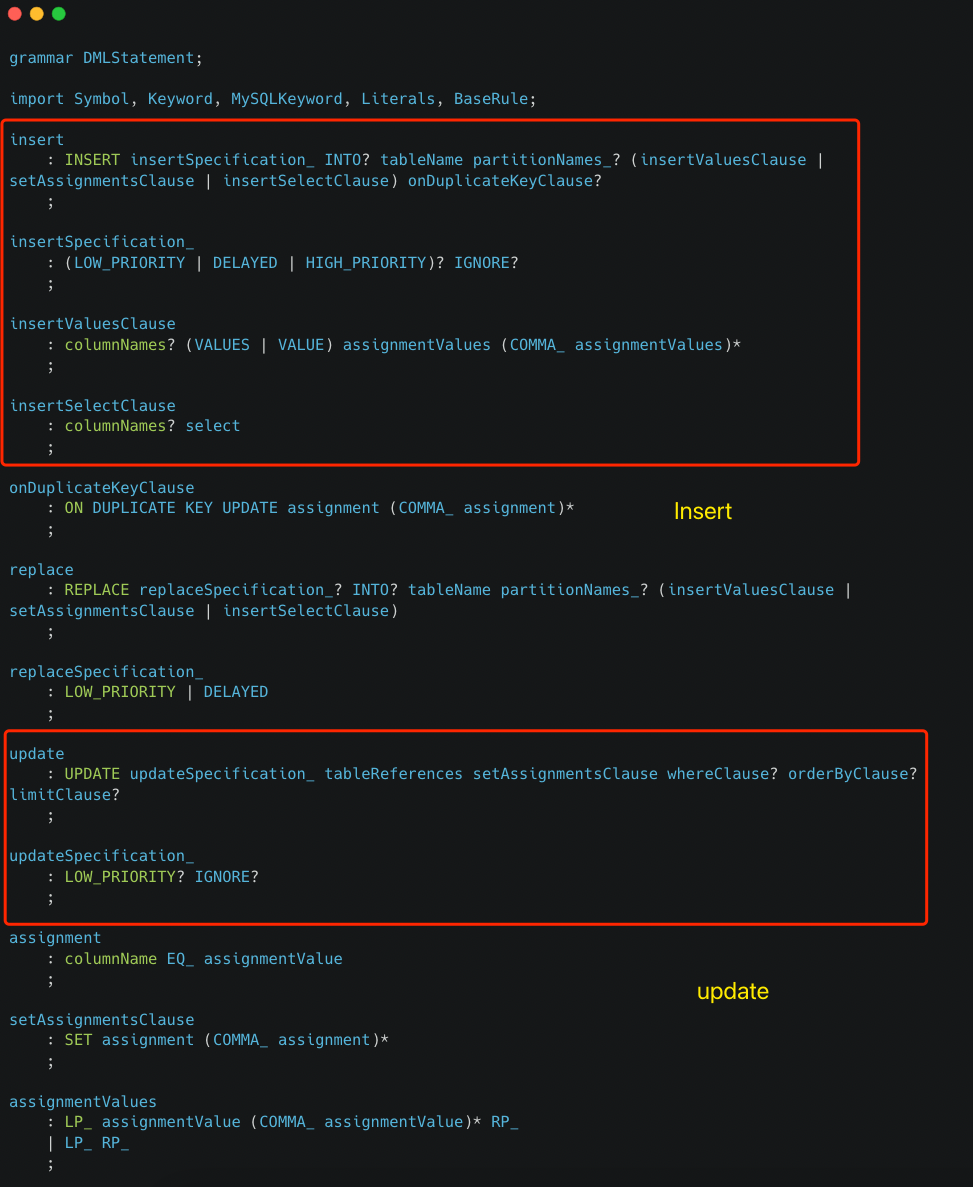 如上图 DML 描述文件片段,我们可以看到针对 SELECT 语句 、UPDATE 语句 都给出了相关语法描述。 每种语法规则像搭建积木一样,按照特定的规则搭建起来。