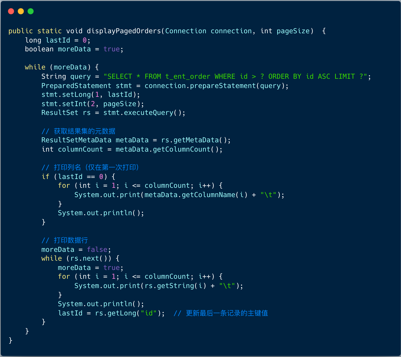 这种方式其实和主键分页查询的目的是一样的,尽量减少每次查询的数据量,避免 OOM 的风险,同时也可以不断的按照顺序查询,避免出现数据丢失和重复。