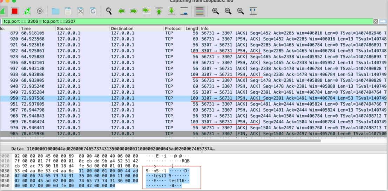 通过 wireshark 抓包,可以看到每执行一次 rs.next() 就会向 mysql 服务发送一个请求,同时 mysql 服务返回两条数据: