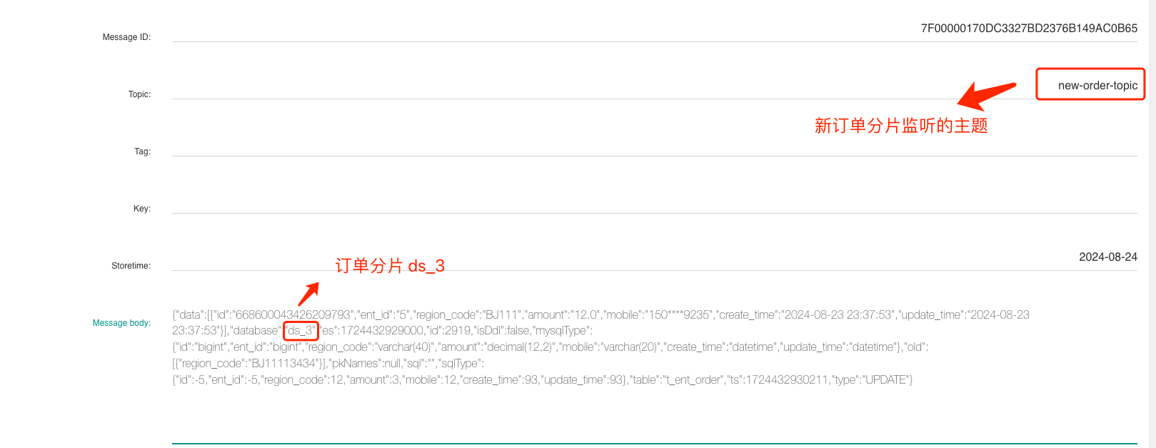 接下来,我们同样修改新订单分片 ds_3 订单表的一条记录,从 RocketMQ 控制台即可查询出该条 Binlog 消息: