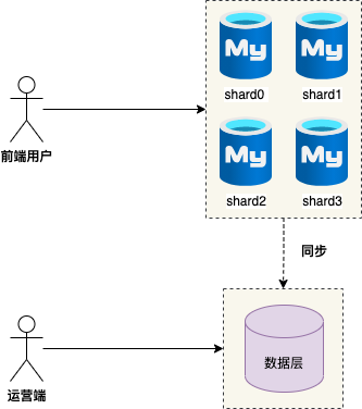 2、数据层各司其职,N 个分片数据库负责前端访问 , 而异构的数据库负责运营端访问 。