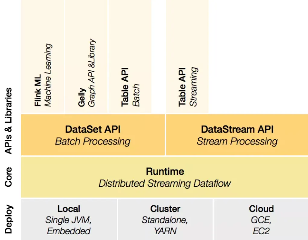 - Layered APIs: 流式和批量数据上的 SQL、数据流 API 和数据集 API、ProcessFunction(时间和状态)