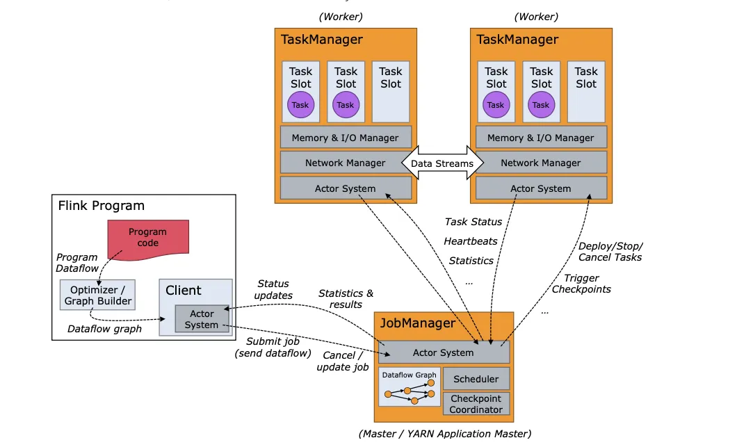 YARN上部署的过程是:客户端把Flink应用提交给Yarn的ResourceManager,Yarn的ResourceManager会向Yarn的NodeManager申请容器。在这些容器上,Flink会部署JobManager和TaskManager的实例,从而启动集群。Flink会根据运行在JobManger上的作业所需要的Slot数量动态分配TaskManager资源。