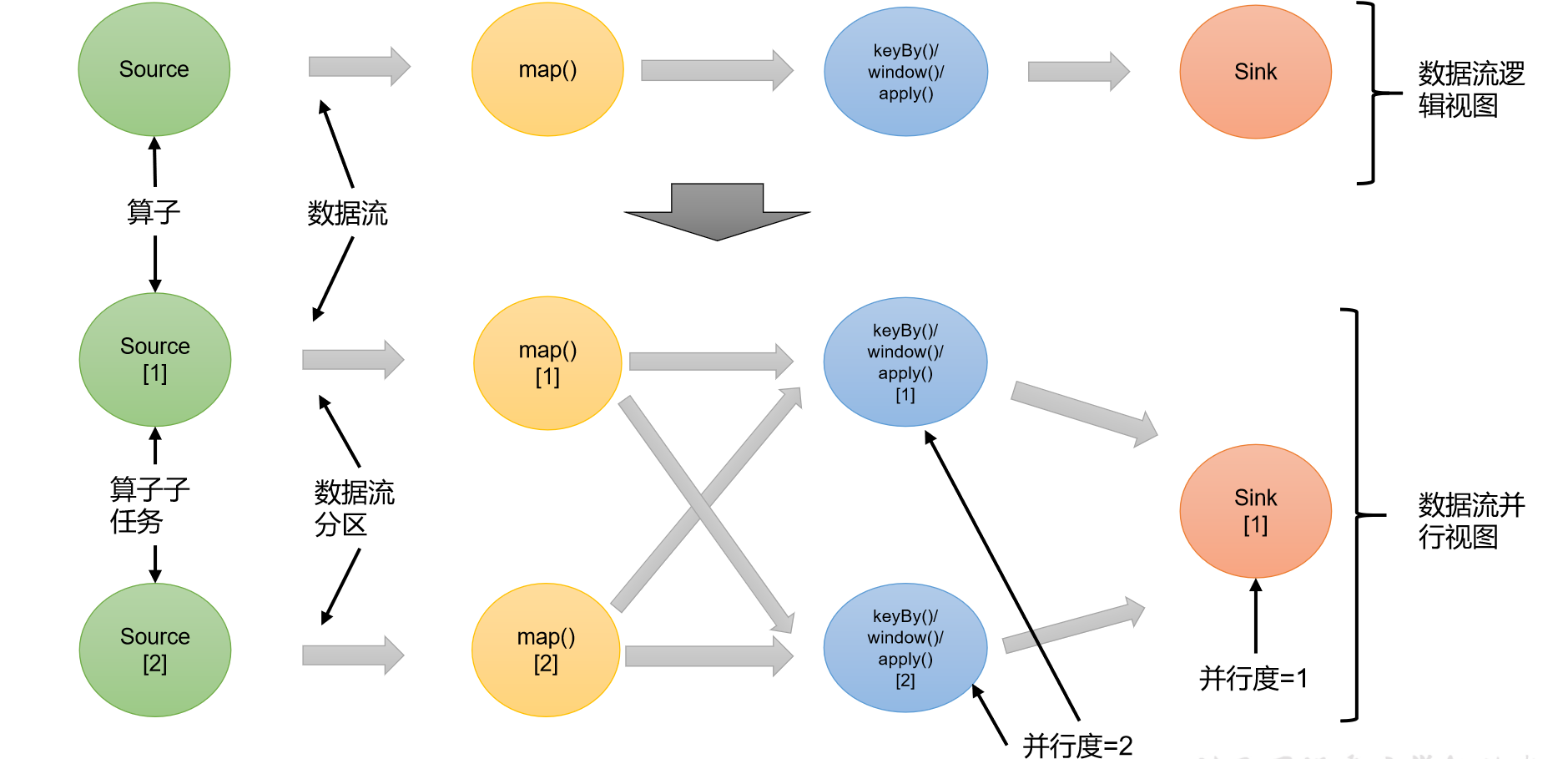一个特定算子的子任务(subtask)的个数被称之为其并行度(parallelism)。这样,包含并行子任务的数据流,就是并行数据流,它需要多个分区(stream partition)来分配并行任务。一般情况下,一个流程序的并行度,可以认为就是其所有算子中最大的并行度。一个程序中,不同的算子可能具有不同的并行度。